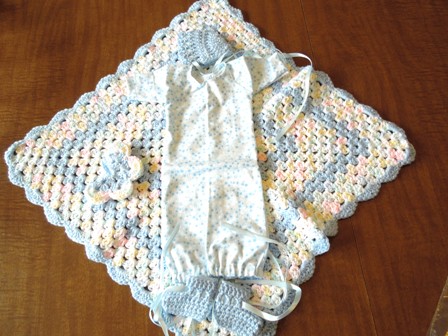 Another donation has been received from Marianne in New York. Marianne creates the entire ensemble herself....by sewing each gown and crocheting the afghans, bonnets, booties and butterflies.